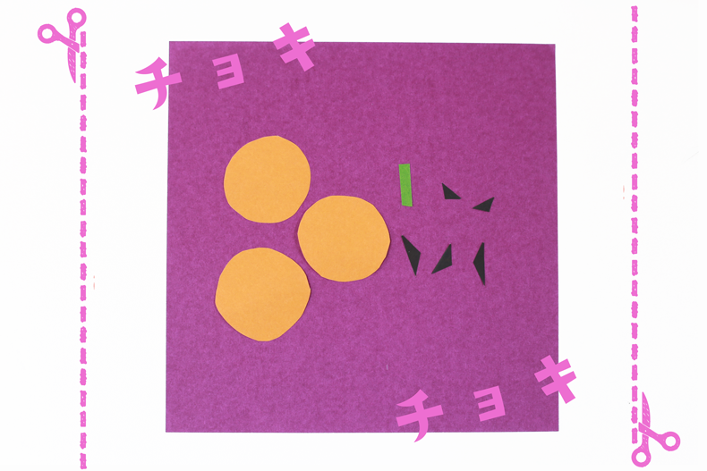 オレンジの○を三つ重ね、その上に黒い細かいパーツをのせると……