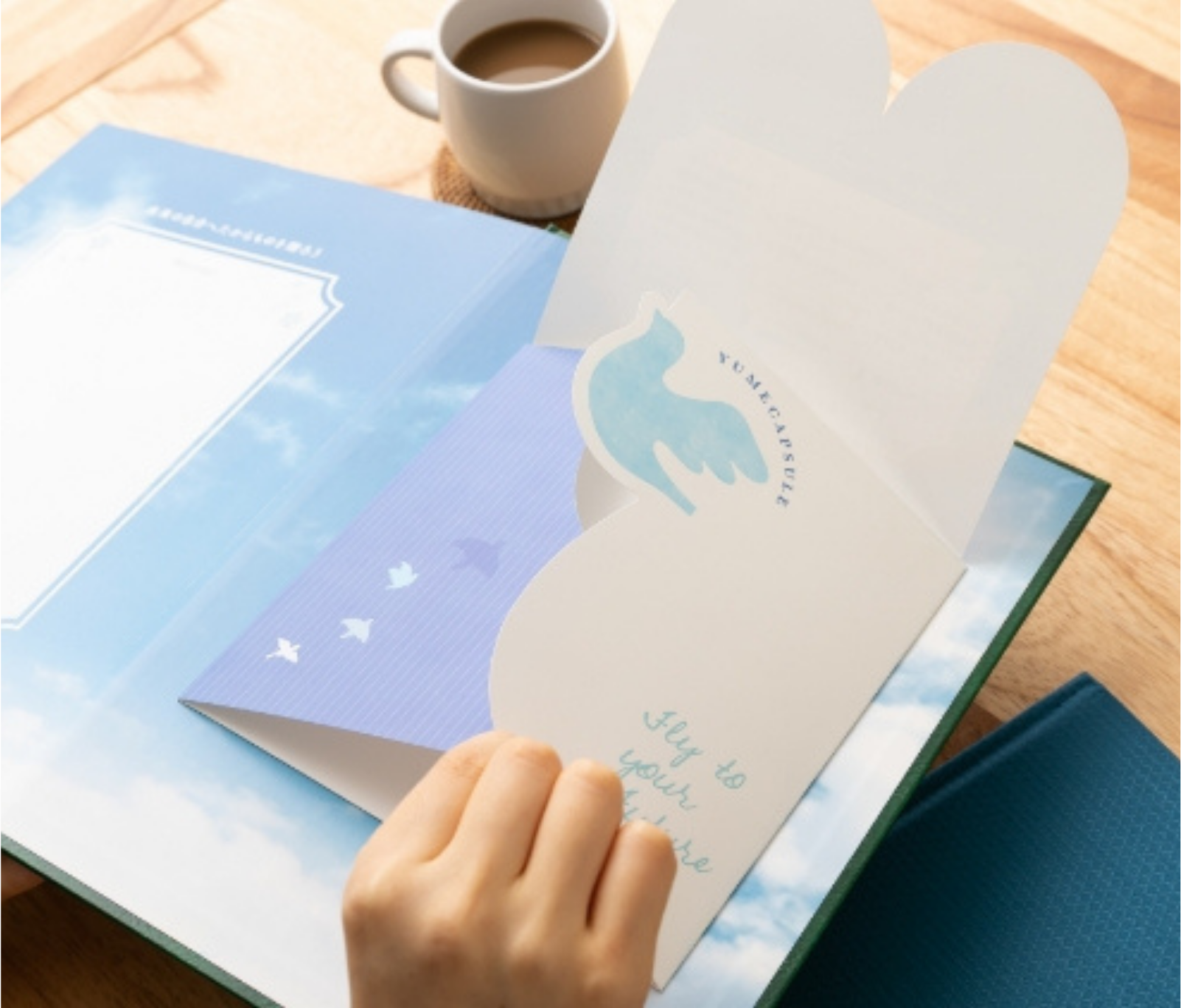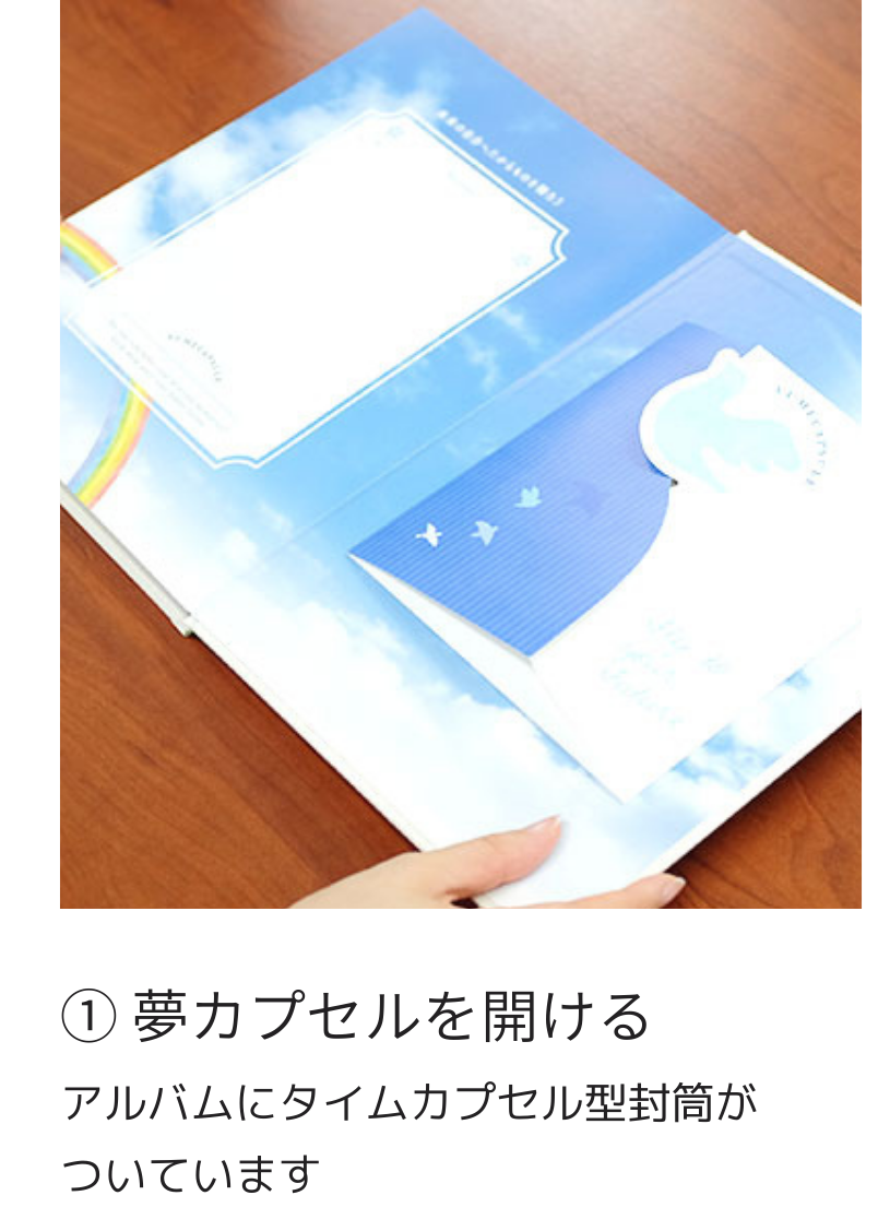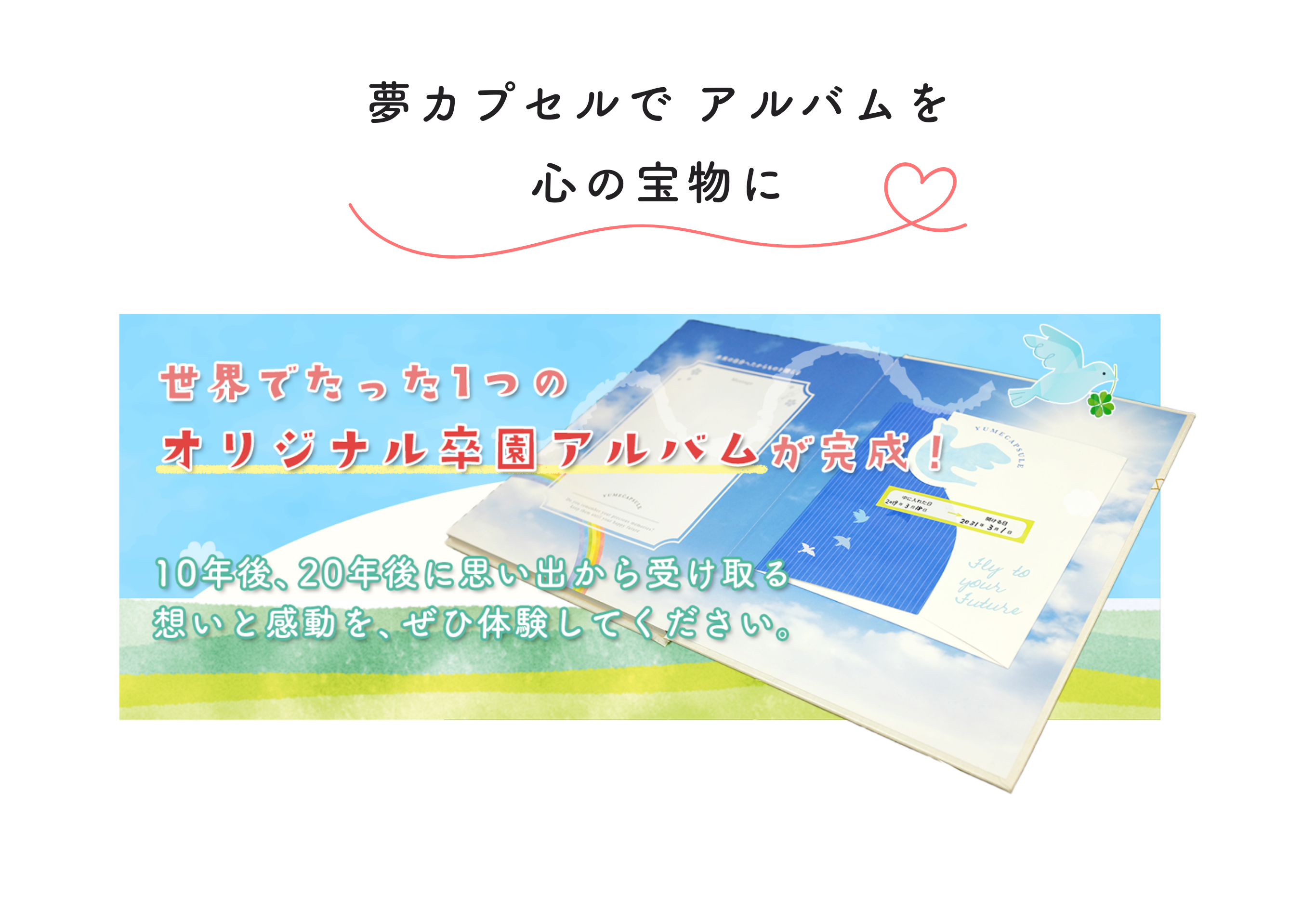 卒業・卒園アルバムを宝物にするために、子どもたちが大人になってアルバムを開く機会に「感動のストーリーが生まれるような仕掛けを作ろう」と開発したのが、この卒アルについているタイムカプセル型封筒の『夢カプセル』です。