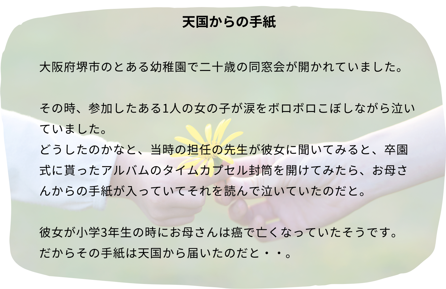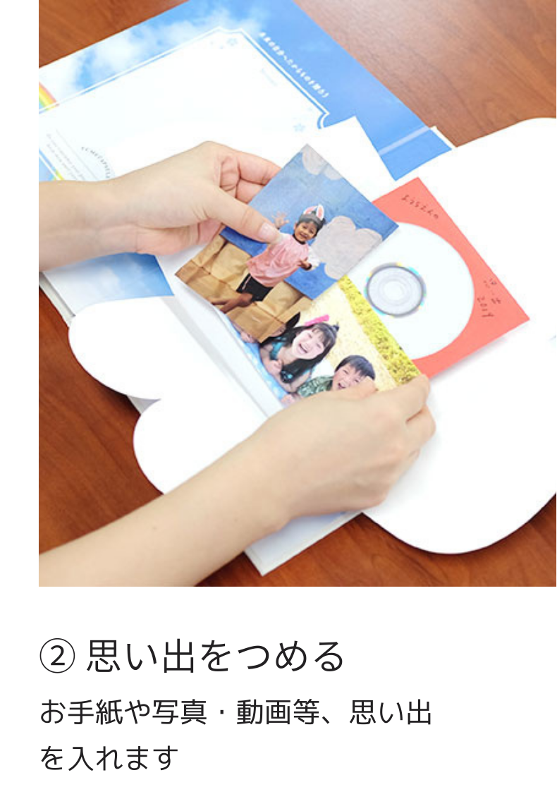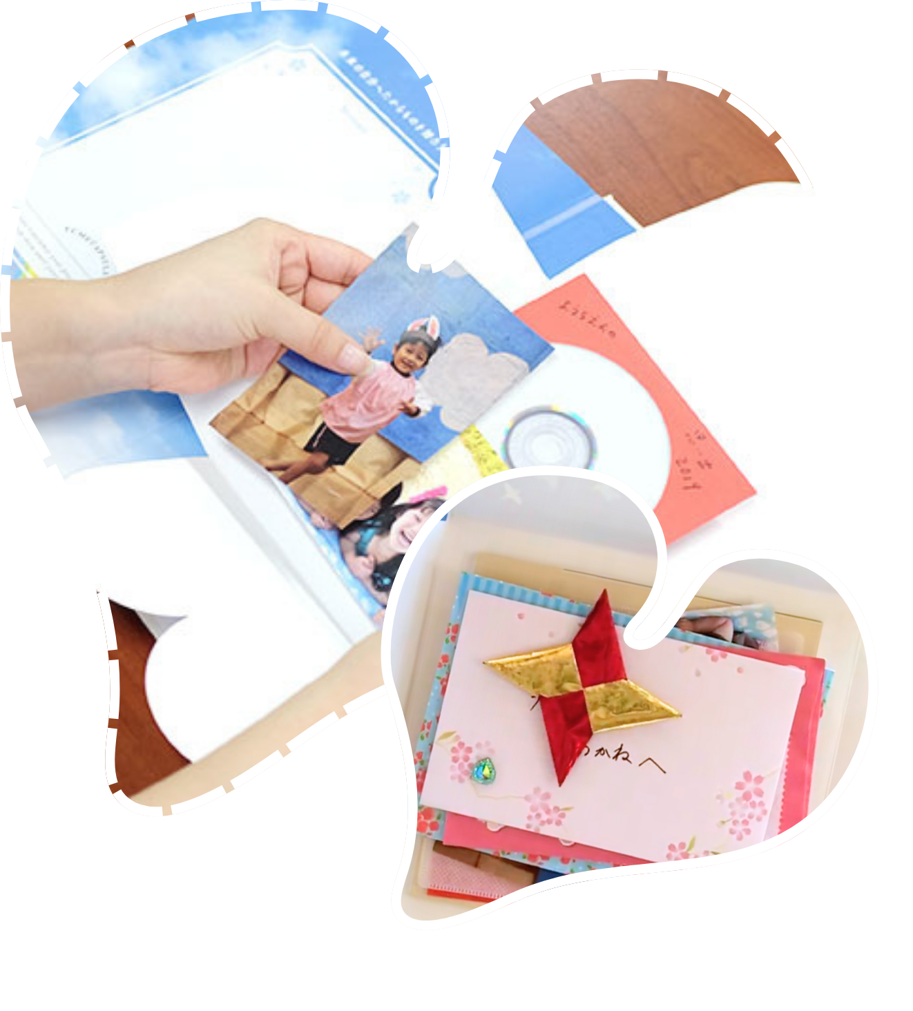 卒園・卒業時に両親や先生、友達からのお手紙や思い出の写真を入れて、十数年後に開封してもらえれば、きっとあなたの笑顔をつくり、お守りとなってくれます。