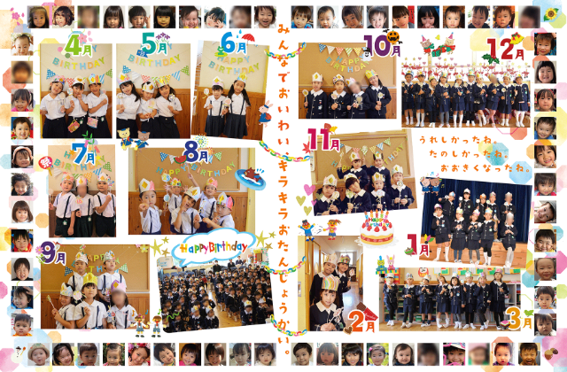 毎⽉のお誕⽣⽇会も⽴派な⾏事の⼀つ。⼀⼈ひとりが主役のお誕⽣⽇会の写真を、らくらく制作ソフトの素材でかわいくデコレーション。